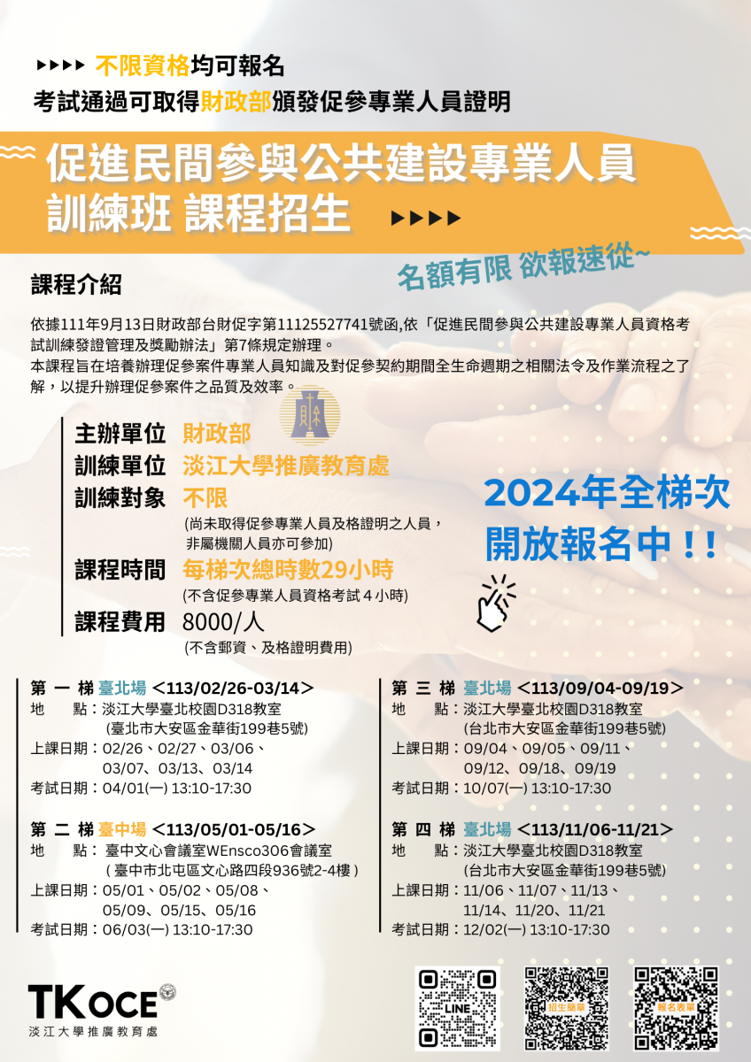 - 訓練對象:不限(尚未取得促參專業人員及格證明之人員,非屬機關人員亦可參加。)