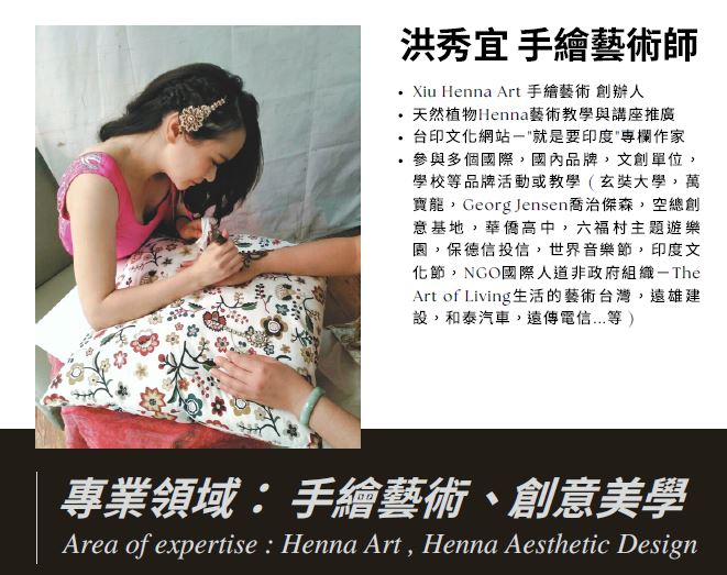 Henna-已有幾千年歷史的古老手繪藝術,以一種名為"指甲花"的植物葉子調製成天然的人體彩繪染料,繪製的圖案只會在身上停留7-14天便逐漸褪去;而圖案與繪畫本身,都帶有祝福與祈福之意,繪製圖案的人就像是給予祝福的人,可說是一種自然又深具內涵的古老彩藝術!